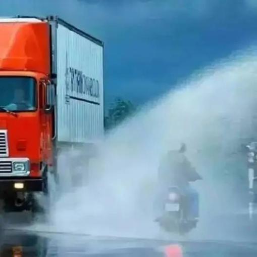 大型车在雨天行驶会给小型车辆带来很多潜在危险,小型车辆要远离它们。