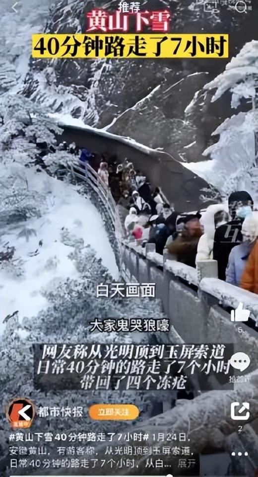 另有网友表示,由于景区里人太多,自己从12点开始下山,一直堵到晚上7点多。还有网友称,从光明顶到玉屏索道,日常40分钟的路走了7个小时,带回了4个冻疮。1月25日,景区工作人员回应,春节加下雪导致拥堵,但都安全将游客送下山了,买到票的游客可以正常游玩。