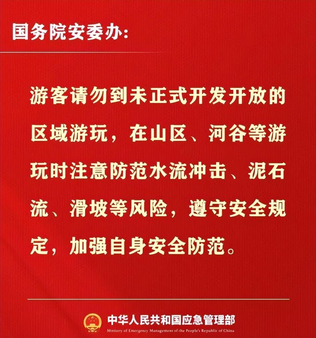 今日,国务院安委办也紧急发布安全提示,各地各有关部门要加强景区景点安全监管,排查各类风险隐患,设立警示标牌,安排专人巡查;游客请勿到未正式开发开放的区域游玩,在山区、河谷等游玩时注意防范水流冲击等风险,遵守安全规定,加强自身安全防范。